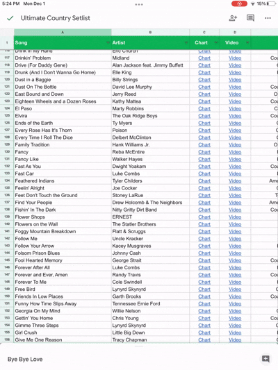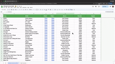 The Ultimate Country Setlist is a complete, ready-to-use collection of 500 country songs — organized exactly the way working musicians need it: decade, tempo, genre, artist, plus instant links to Ultimate Guitar chord charts and YouTube performance videos, all packed into an easy to access Google Sheet.Whether you’re a solo act, duo, bar band, wedding performer, honky-tonk hero, or brand-new to gigging, this setlist vault gives you a proven, crowd-tested country repertoire you can start using right away.LIMITED TIME OFFER: I originally built this setlist for my own use to make it easier to take requests at gigs. This is the first time I’m making it available to the public as a standalone product, so I'm offering it at a special launch price of $27. Fair warning: this deal won't last forever!
